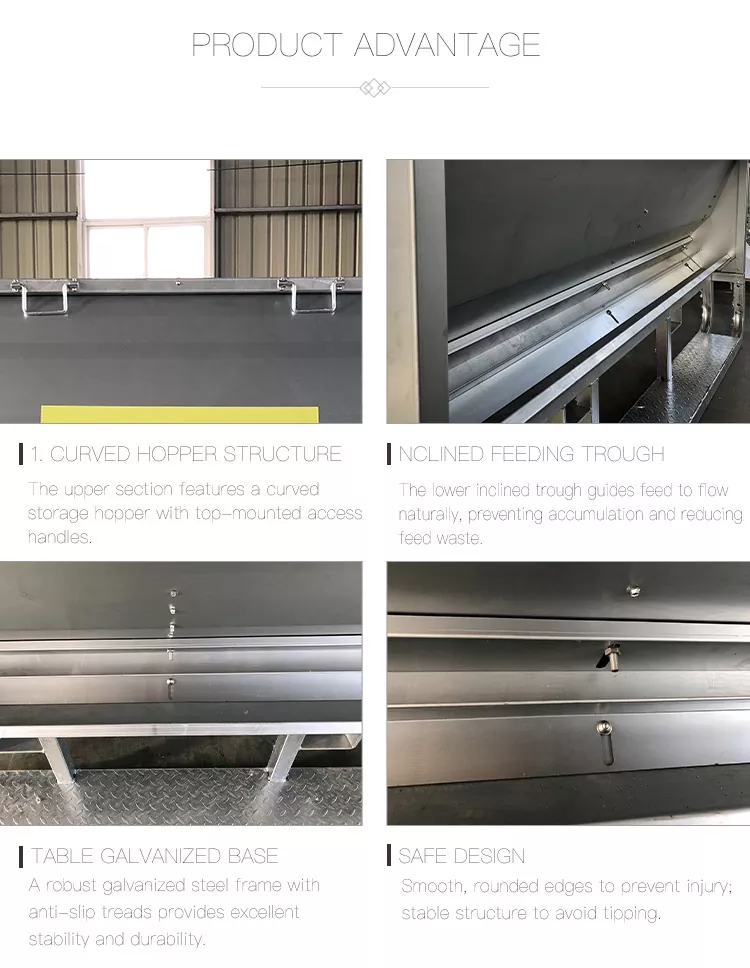 2. Skrånende fôrkar: Den nedre skrånende trauet leder fôret til å flyte naturlig, forhindrer opphopning og reduserer fôrspill.