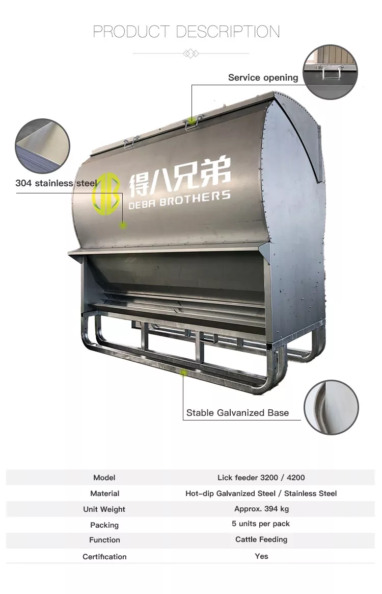Våre båser med gratis tilgang og kraftige galvaniserte storfeslikkematere har en brukervennlig design, er egnet for husdyrhold i alle skalaer, og tilbyr eksepsjonell holdbarhet gjennom førsteklasses materialer og fint utførelse. Disse produktene er godt mottatt av husdyrbønder over hele verden, og har blitt fullstendig verifisert for stabil ytelse og høy kostnadseffektivitet.