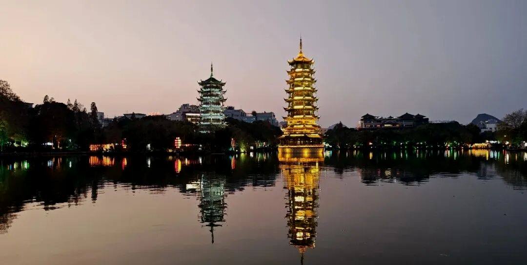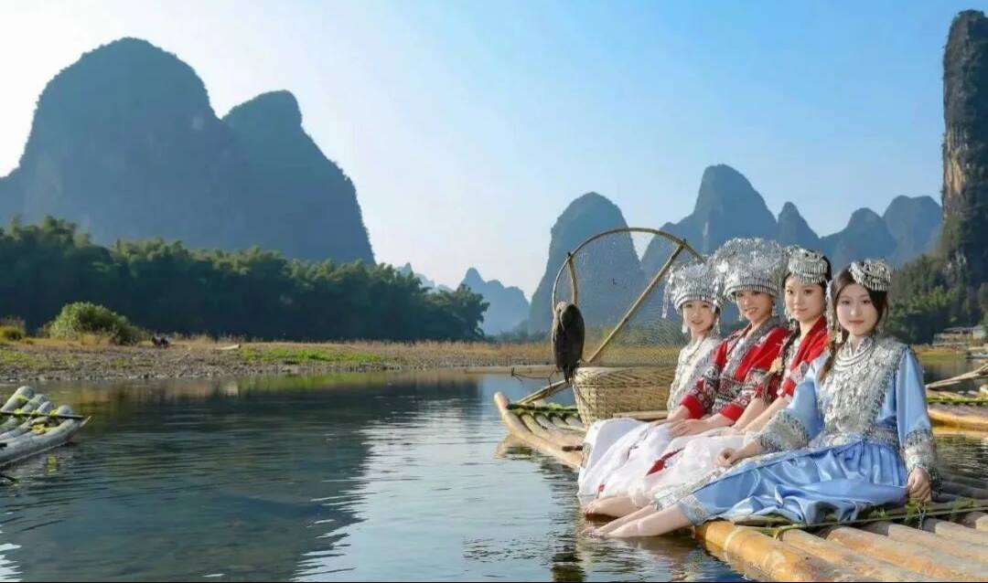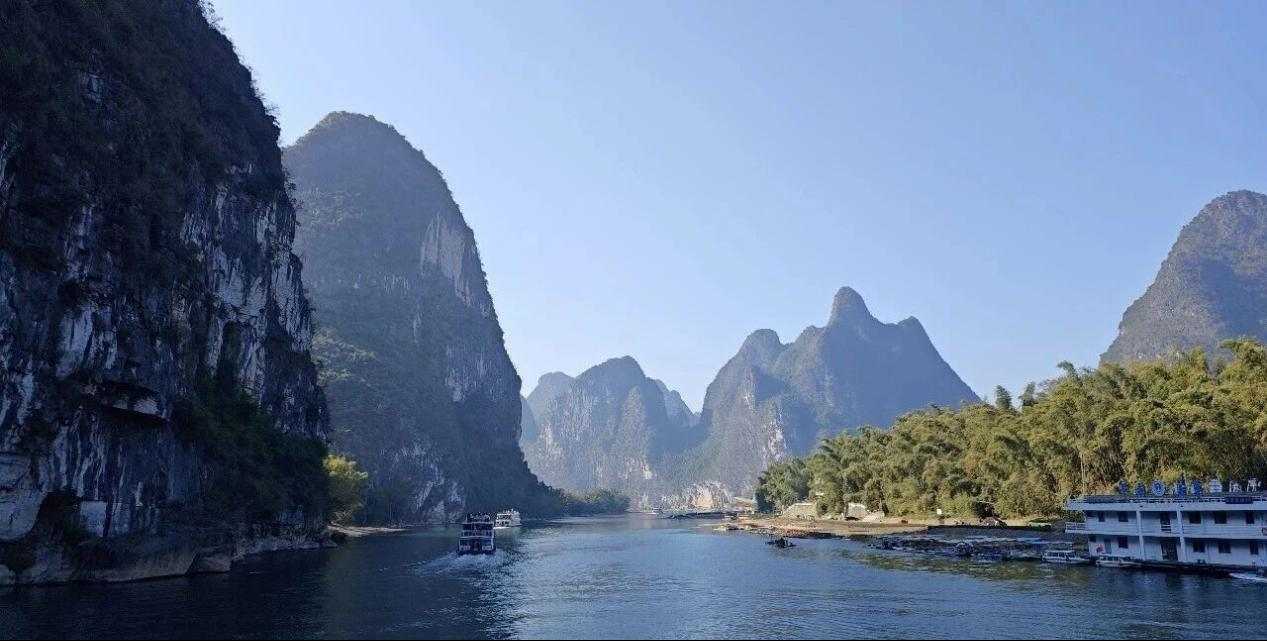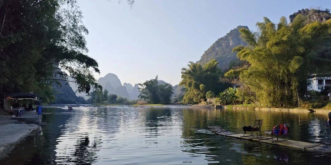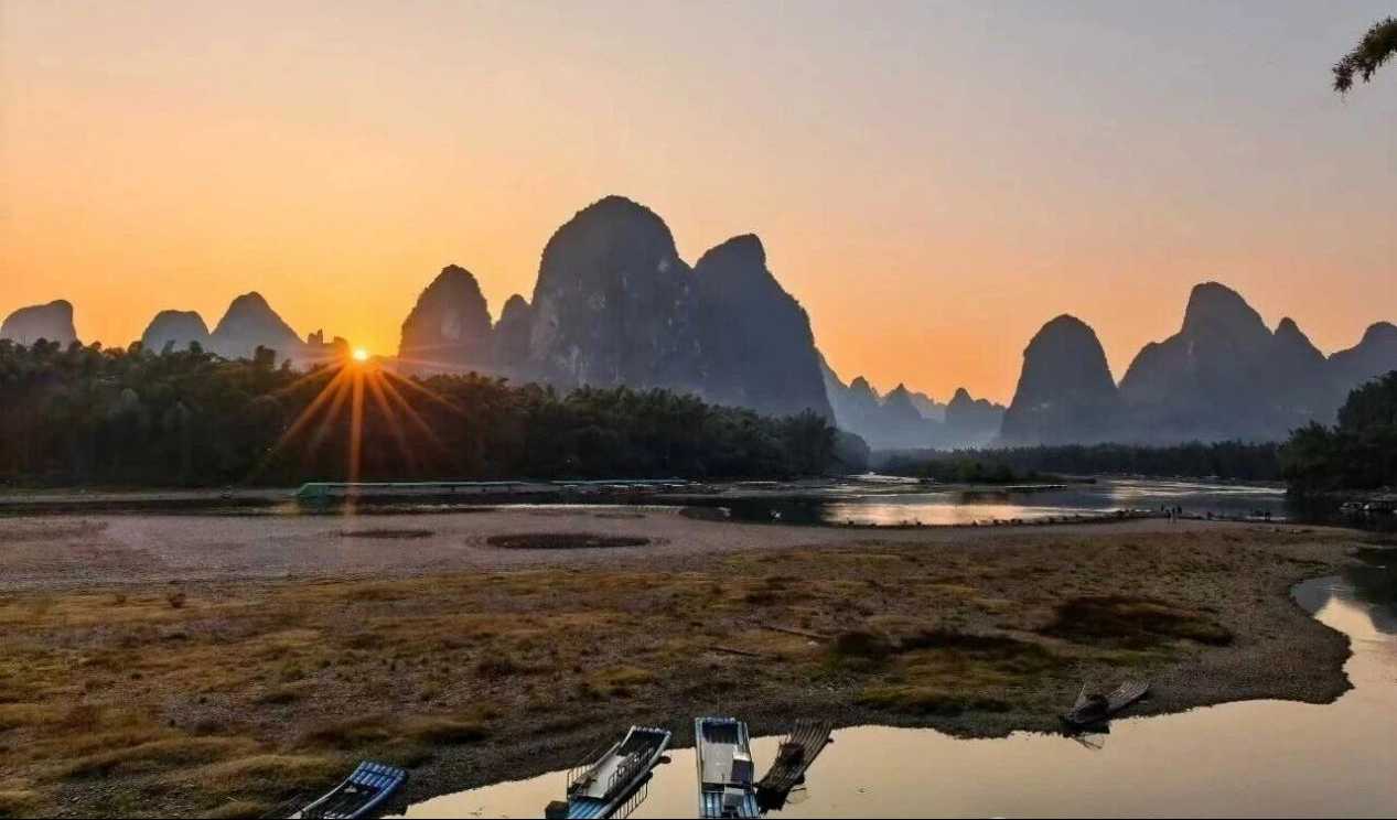 Vannet i Lijiang-elven ligger helt stille – stillhet så dyptgående ingen følelse av flyt registrerer; vannet i Lijiang-elven renner krystallklart – klarhet skarp nok til å avsløre hver eneste stein og sandkorn på elveleier; vannet i Lijiang-elven lyser smaragdgrønt – grønnheten er levende som feilfri jadeitt uberørt av lyte. Bare krusninger som sprer seg utover fra åras milde slag signaliserer at båten glir fremover, elvebredder glir bakover. På tvers av generasjoner – de som er født på 1970-, 1980-, 1990-, 2000-tallet – hilser denne passasjen alle i grunnskoleårene. Likevel blekner beskrivelsene ved siden av førstehåndssyn: Lijiang-elven slynger seg tre hundre mil, og viser Huangbu Reflections, Nine Horses Fresco Hill. Hver kurve langs Lijiang presenterer landskap; hvert hjørne i Yangshuo ligner maling
